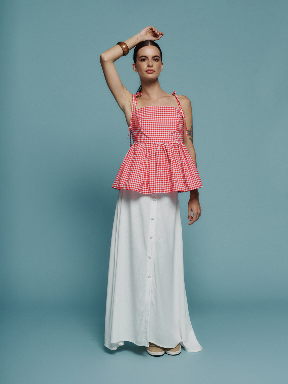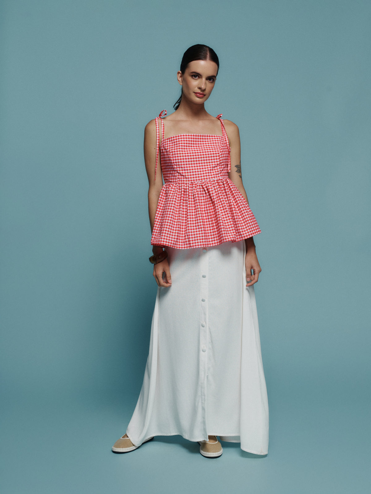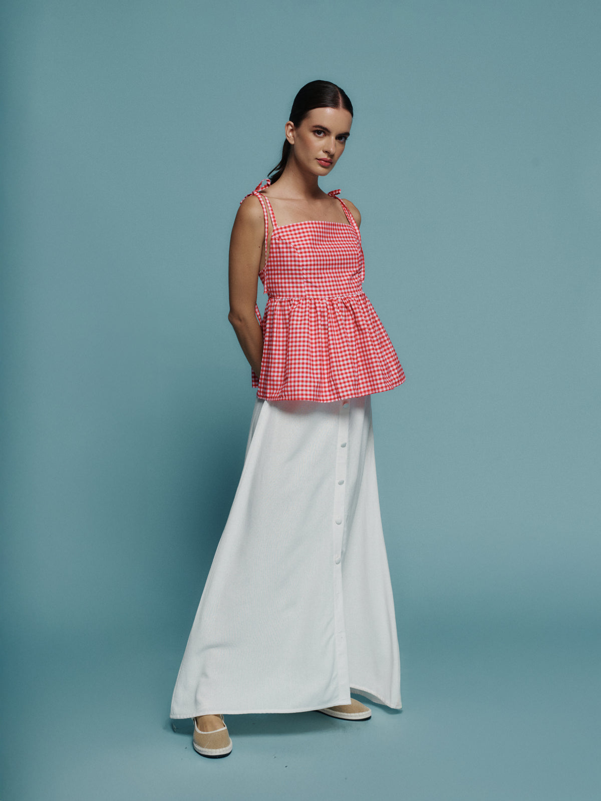 Falda ligera de verano, diseño fresco con detalle de botones frontales y cierre lateral para un ajuste cómodo y favorecedor. Perfecta para looks relajados y luminosos.